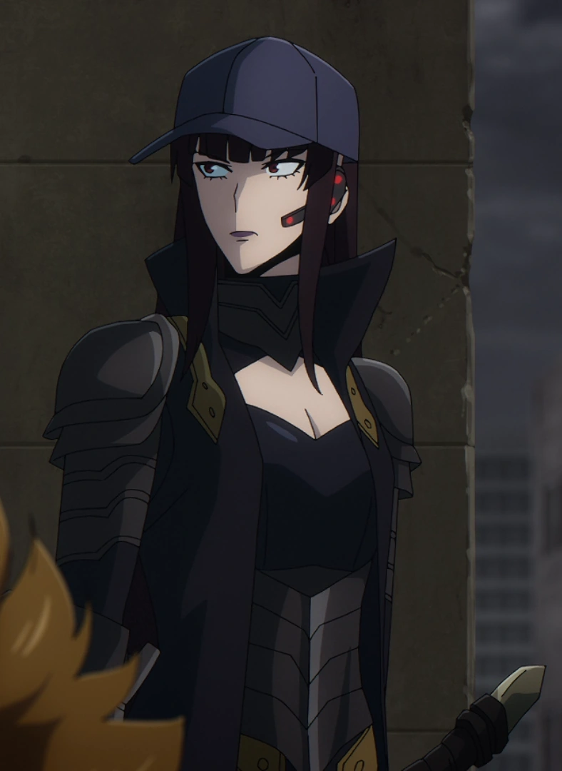 During her first appearance, she wore a purple baseball cap, a pink jacket, and black pants. During the Japan Crisis Arc, she wore her hair in pigtails and was dressed in a loose pink jacket that showed her midriff, black armored boots, and black baggy pants, with two katanas hanging from the left side of her waist.[1]